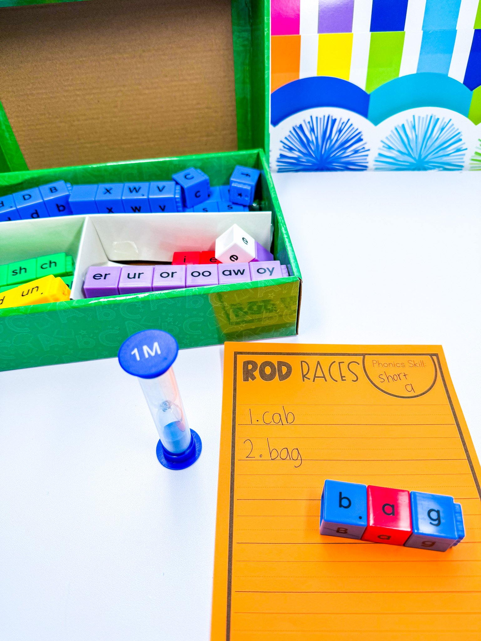 Choose your phonics skill, set up a sand timer, and race to see how many words you can build with your Reading Rods before the timer runs out!