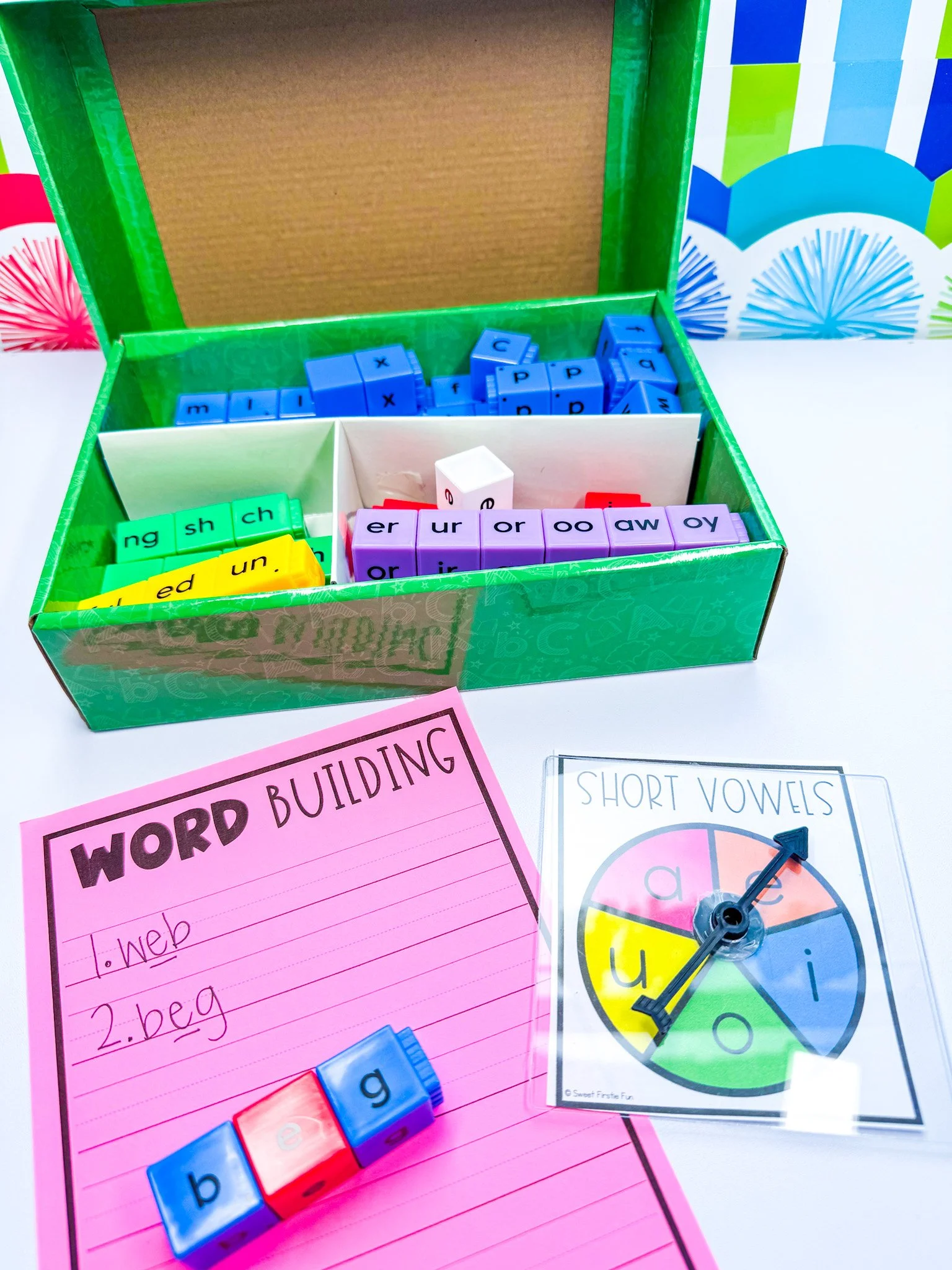 Choose a phonics skill and cut/place some pictures of words that fit that particular phonics skill in a bag or bowl. Then grab a picture, build the word with your Reading Rods, and record the word on your recording sheet! Recording Sheets are freebies for the Firstie Fam.