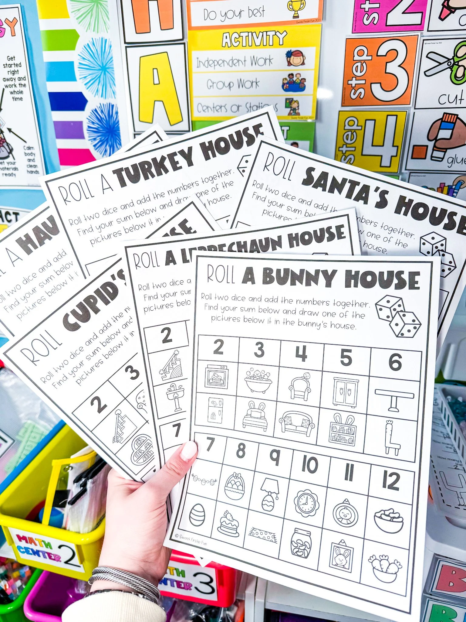 These holiday themed addition fact fluency games are so much fun and are LOVED by students! Students can roll dice, add the numbers, and find the image that they need to place in their themed house. We love a game that practices fact fluency AND includes creativity! Just print and play with dice!