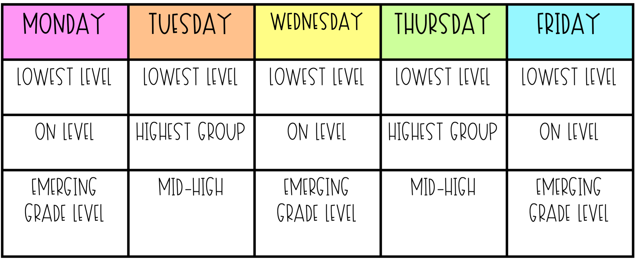This varies from district to district and teacher to teacher, so please take this with a grain of salt! The meeting schedule below is what works for my classroom, but changes year to year based on the different levels within my room. Generally I try to see the lowest level group each day because they are in need of the most help. I see my higher groups twice a week since they still need help but not the kind of help that the lowest group needs to get them back up to speed. Below is a sample small group schedule (each group meets for 15-20 mins) and the small groups begin after our daily reading lesson and phonics instruction (we have a 2 hour block for literacy, so one hour is dedicated to small groups and one hour is dedicated to whole group phonics/reading instruction).