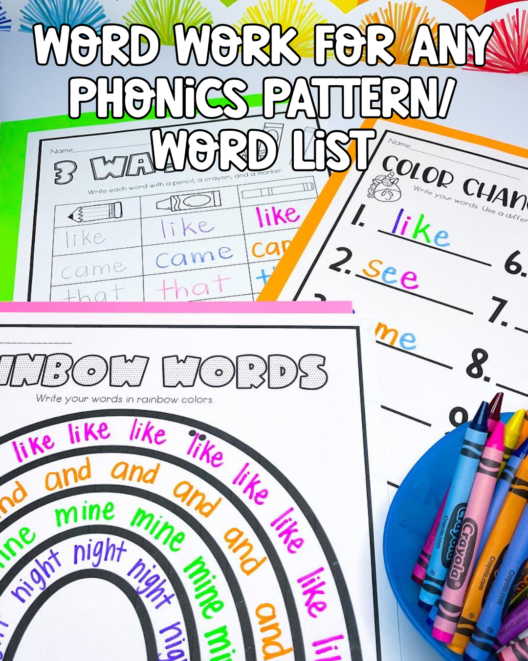 Whatever phonics skill (or word lists) you’re working on, these pages can be used as practice. Students love these pages because they are fun and teachers love them because you just print them and GO.